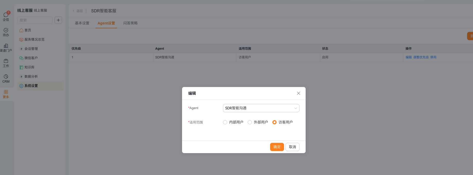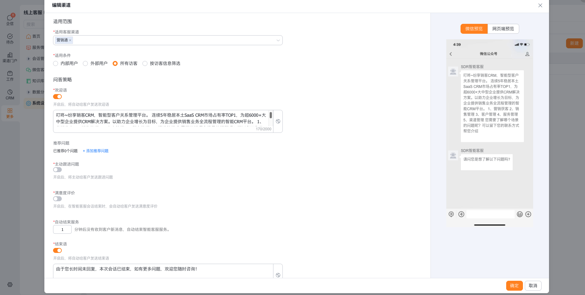 留资字段:勾选需要用户提供的字段(如姓名、电话、公司、职位),在接待场景中,AI会要求用户留资的字段。若没有显示需要的字段,可联系系统管理员在【SDR业务规则】上的【留资字段】上进行新增字段值,再回到该处配置。