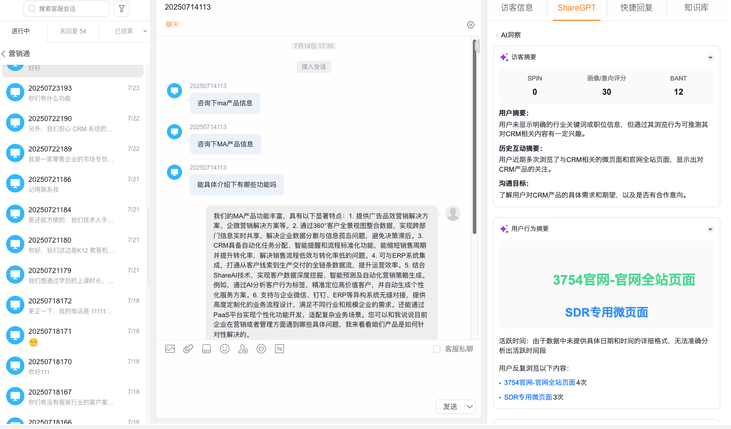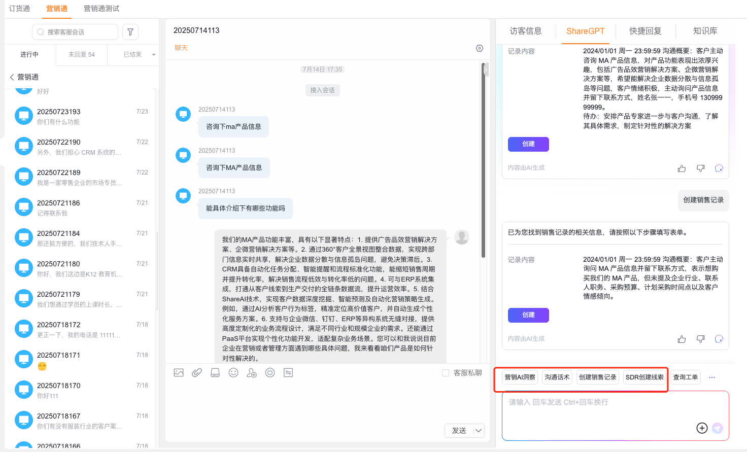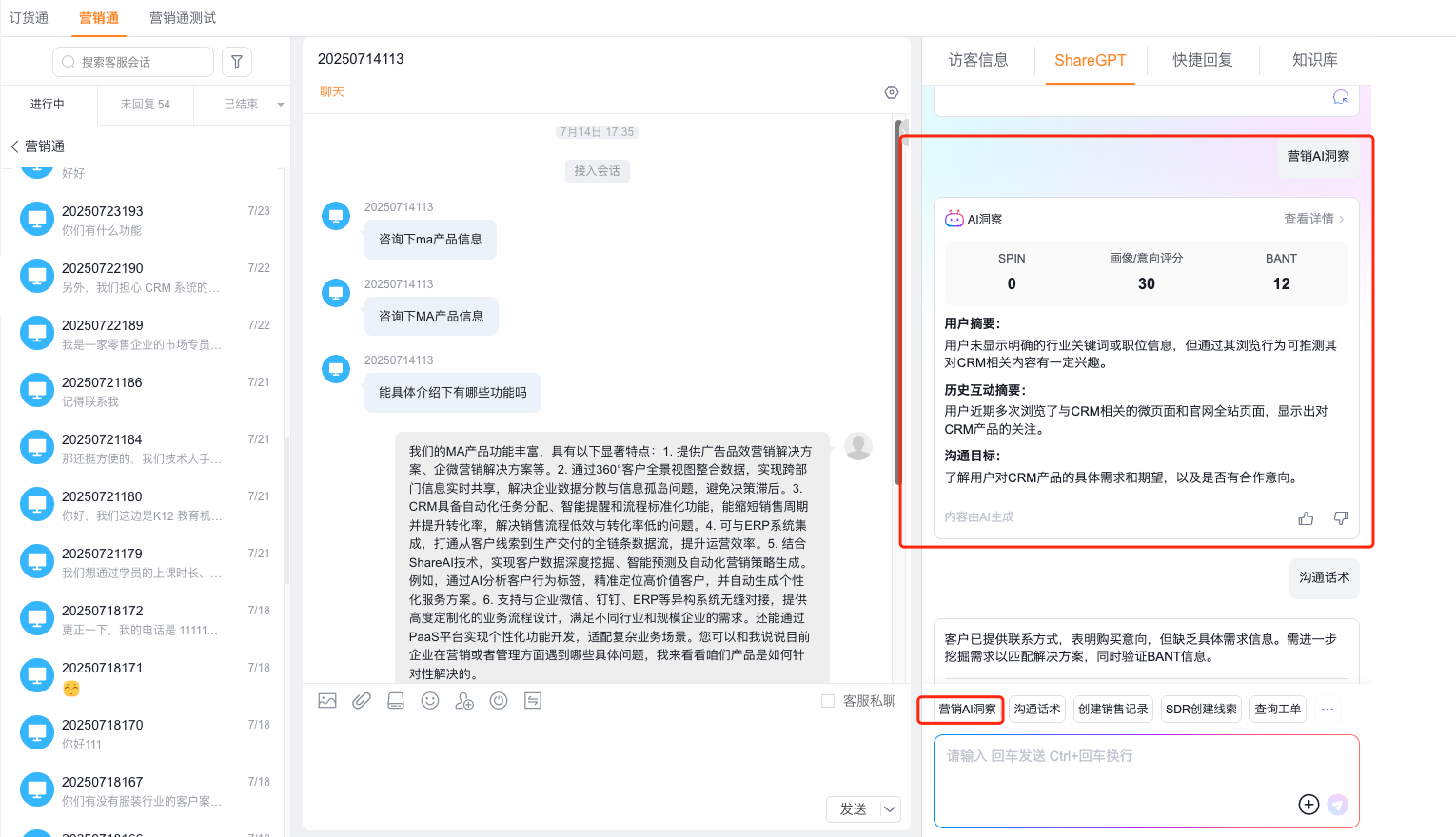 AI自动识别用户意图,结合营销产品画布和知识库内容,生产推荐话术。