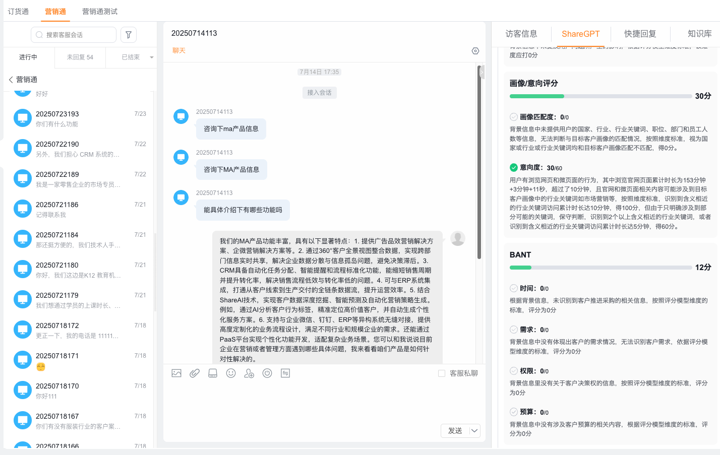 半自动模式:若关闭智能客服,前台用户发送消息会进入人工工作台。支持通过按钮触发AI能力。