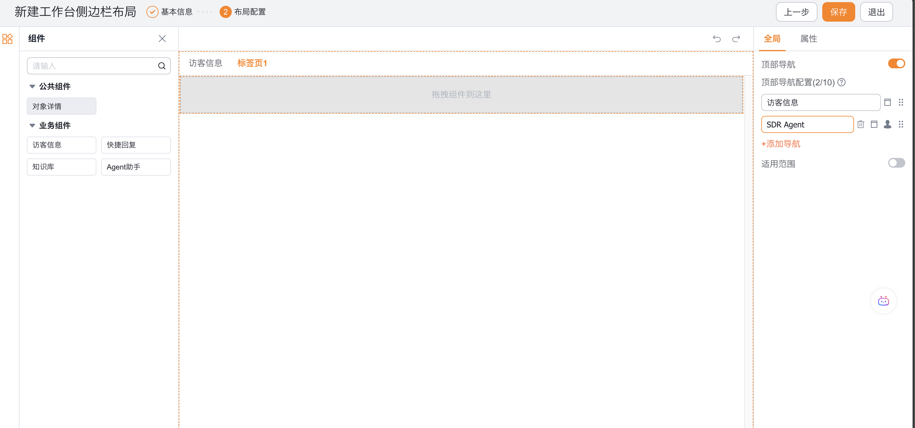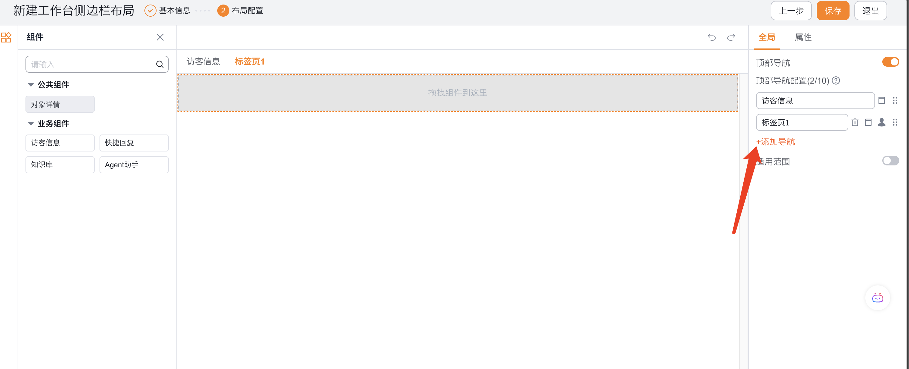 4、进入组件布局配置页面,点击【全局-添加导航】。