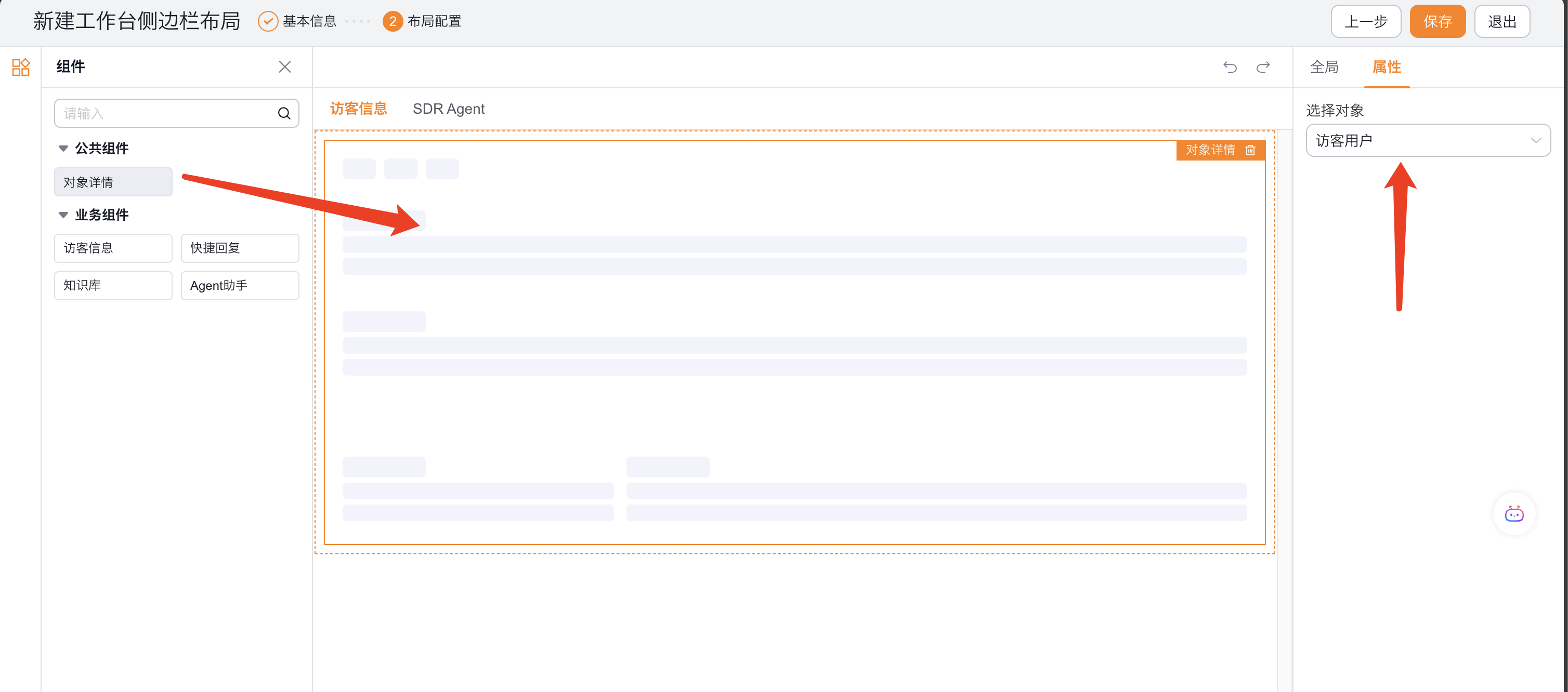 7、将【对象详情】组件拖动到灰色方框内,并在左边【属性-选择对象】选择【访客用户】。