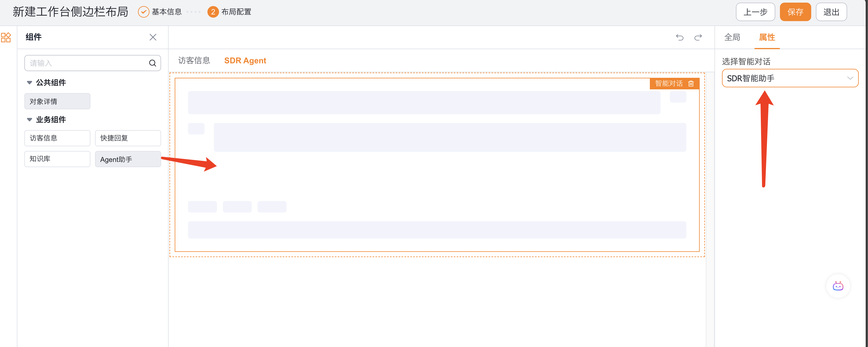 8、将【Agent助手】组件拖动到灰色方框内,并在左边【属性-选择智能对话】选择【SDR智能助手】。