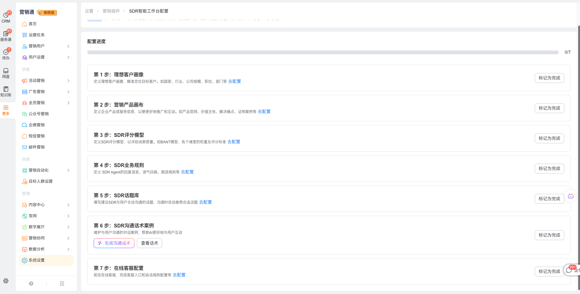 2、进入配置页面逐步进行配置,完成后可标记完成。