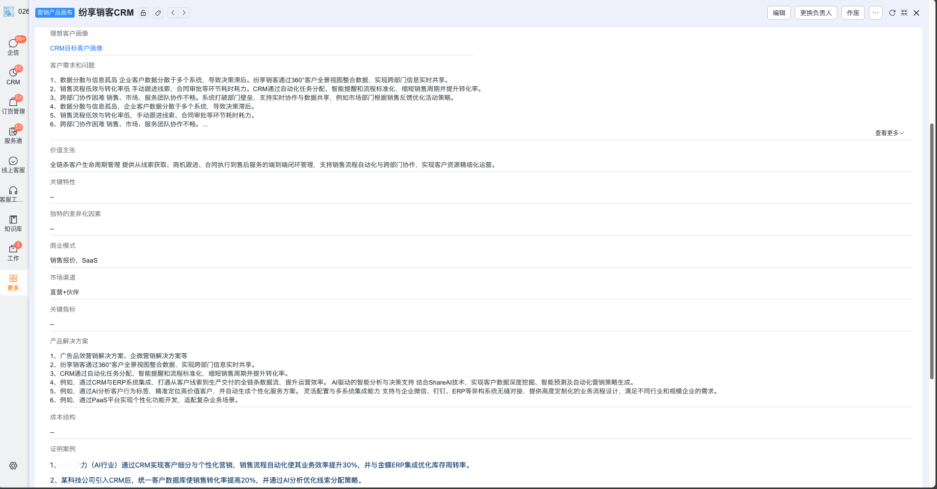 定义企业产品或服务信息,以便更好地推广和互动。如产品官网、价值主张、解决痛点、证明案例等。基于填写的营销产品画布信息,后续在评分模型中,也会参考这个数据去评判客户的匹配度评分。若有多个产品可以填写多个,后续AI可自动识别客户的意向产品。