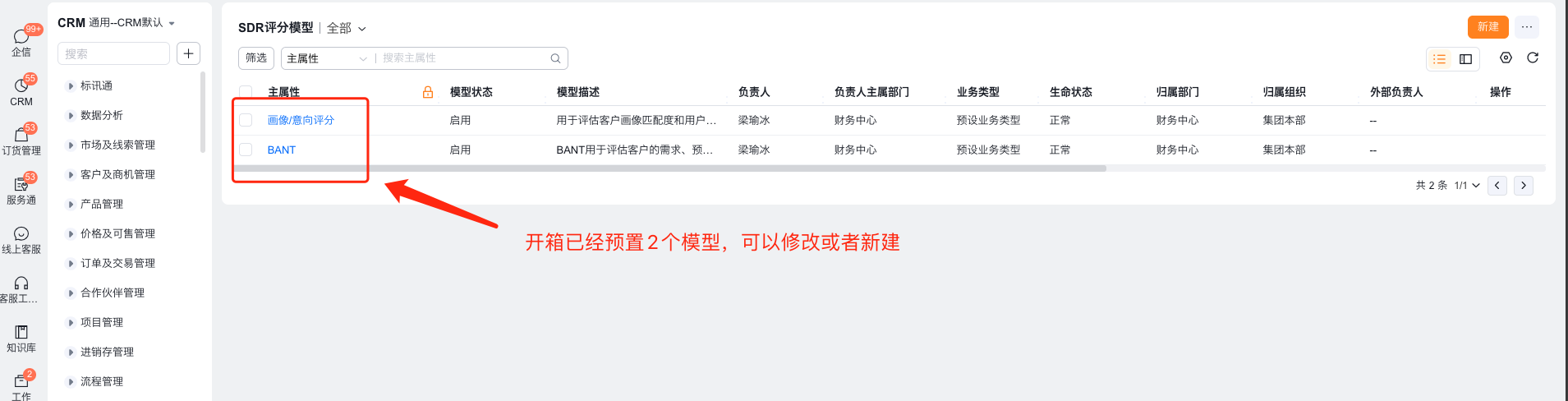 转化模型:可选择以上设置的评分模型(如“BANT”),选择该模型后,系统将据此模型的分数为依据进行筛选及流转线索。