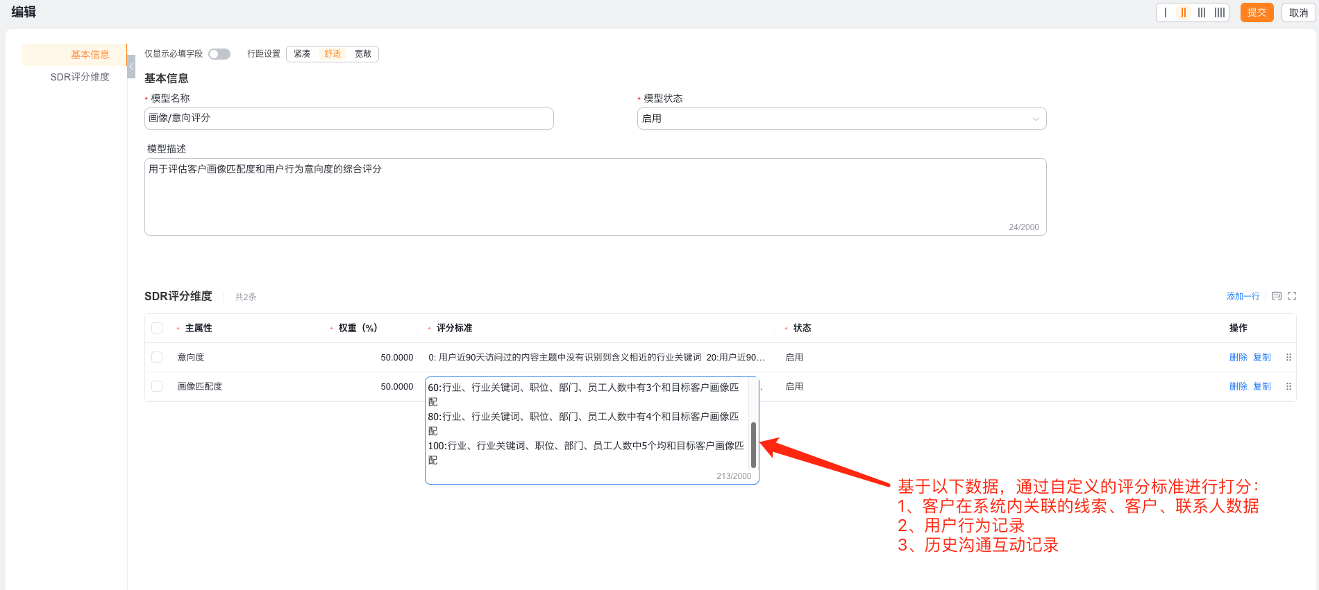 定义SDR评分模型,以评估线索质量。如BANT模型,各个维度的权重及评分标准。