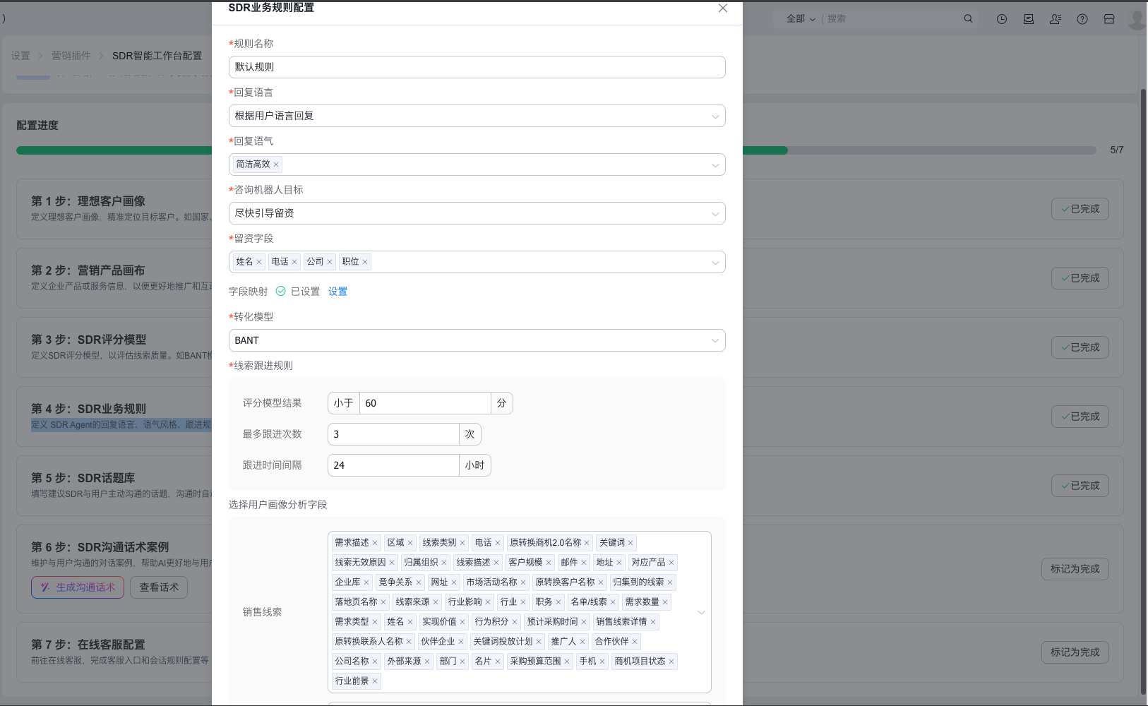 留资字段:勾选需要用户提供的字段(如姓名、电话、公司、职位),在接待场景中,AI会要求用户留资的字段。若没有显示需要的字段,可联系系统管理员在【SDR业务规则】上的【留资字段】上进行新增字段值,再回到该处配置。