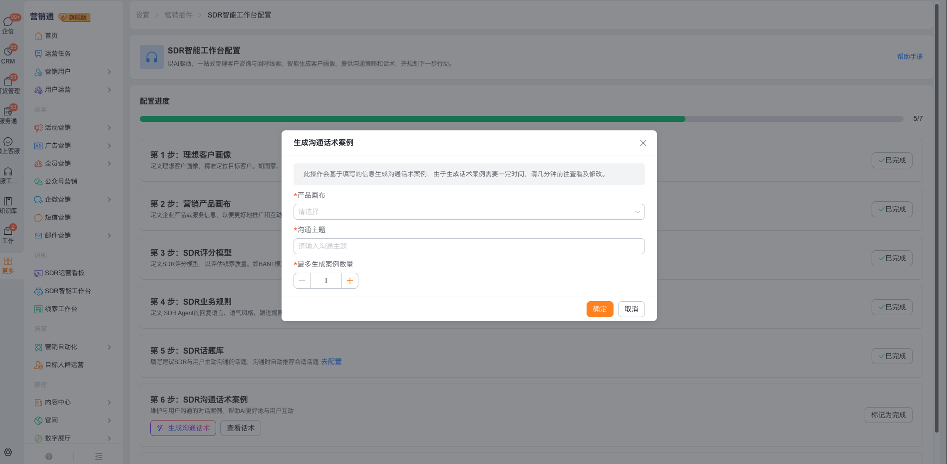 通过提供SDR与用户沟通的对话案例,让AI学习以什么样的形式与用户互动,并为AI的回答提供知识参考。AI可基于营销产品画布和理想客户画像去生成沟通话术案例,支持先由AI生成再人工修改。