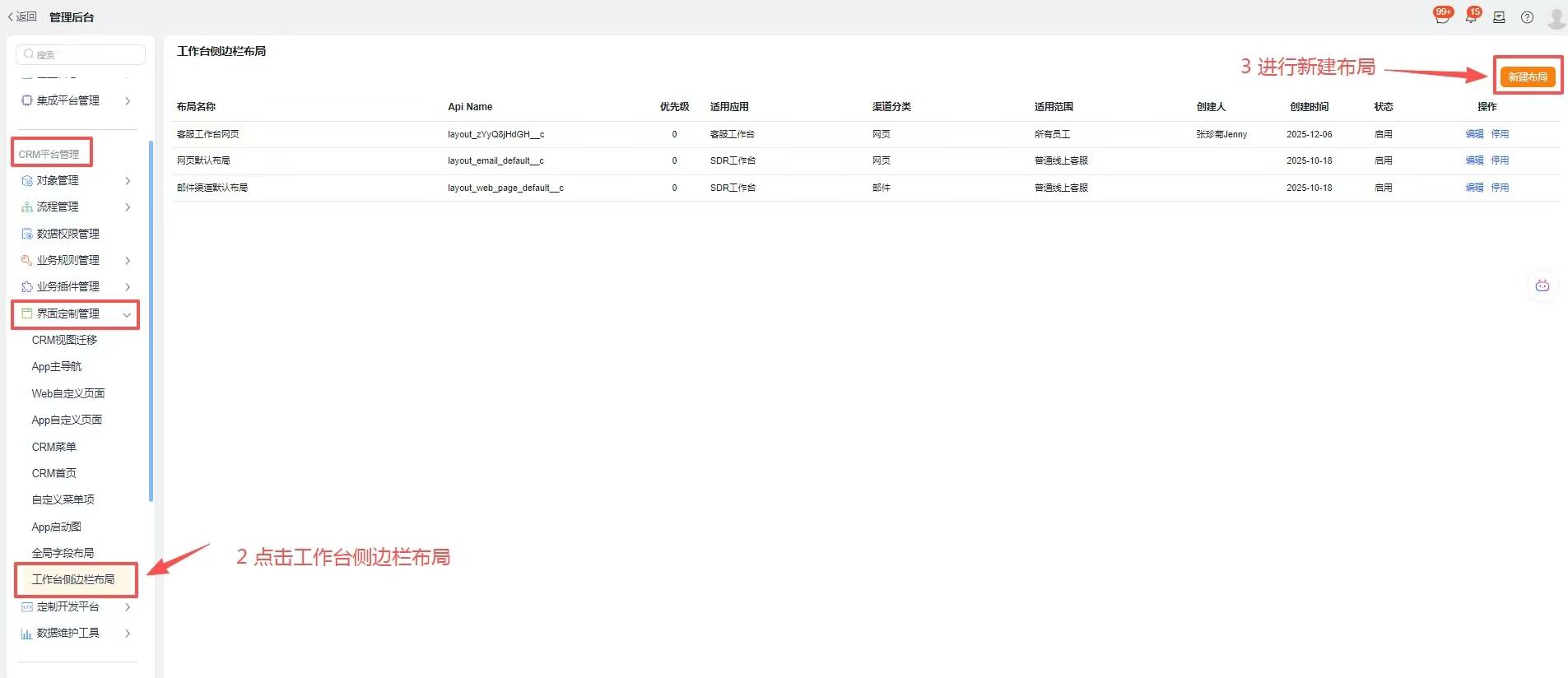 2、点击【CRM平台管理-界面定制管理-工作台侧边栏布局】进入布局配置页面