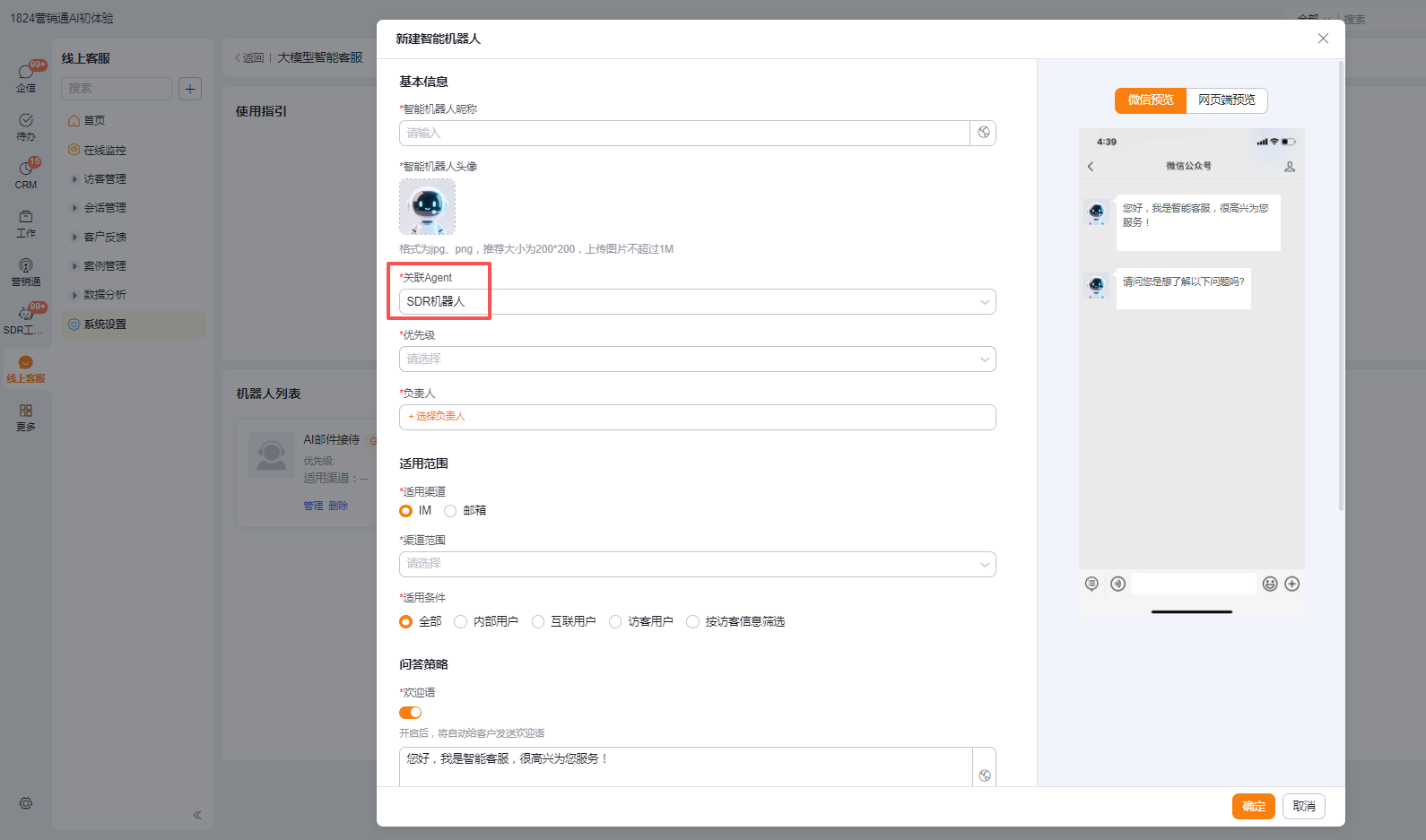 3.3 进入机器人基本信息编辑页面,根据需求配置机器人,其中【关联Agent】选择【SDR机器人】,保存后启用机器人即可开启自动模式。若开启了机器人接待模式,则用户发送消息不会进入人工接待的工作台,只有转人工后才会进入。