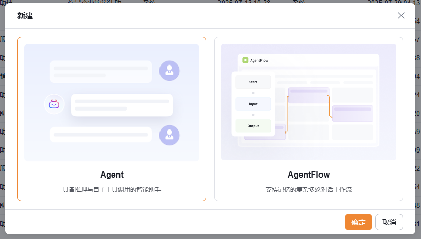 创建 Agent 时,首先需要选择Agent类型:Agent、AgentFlow