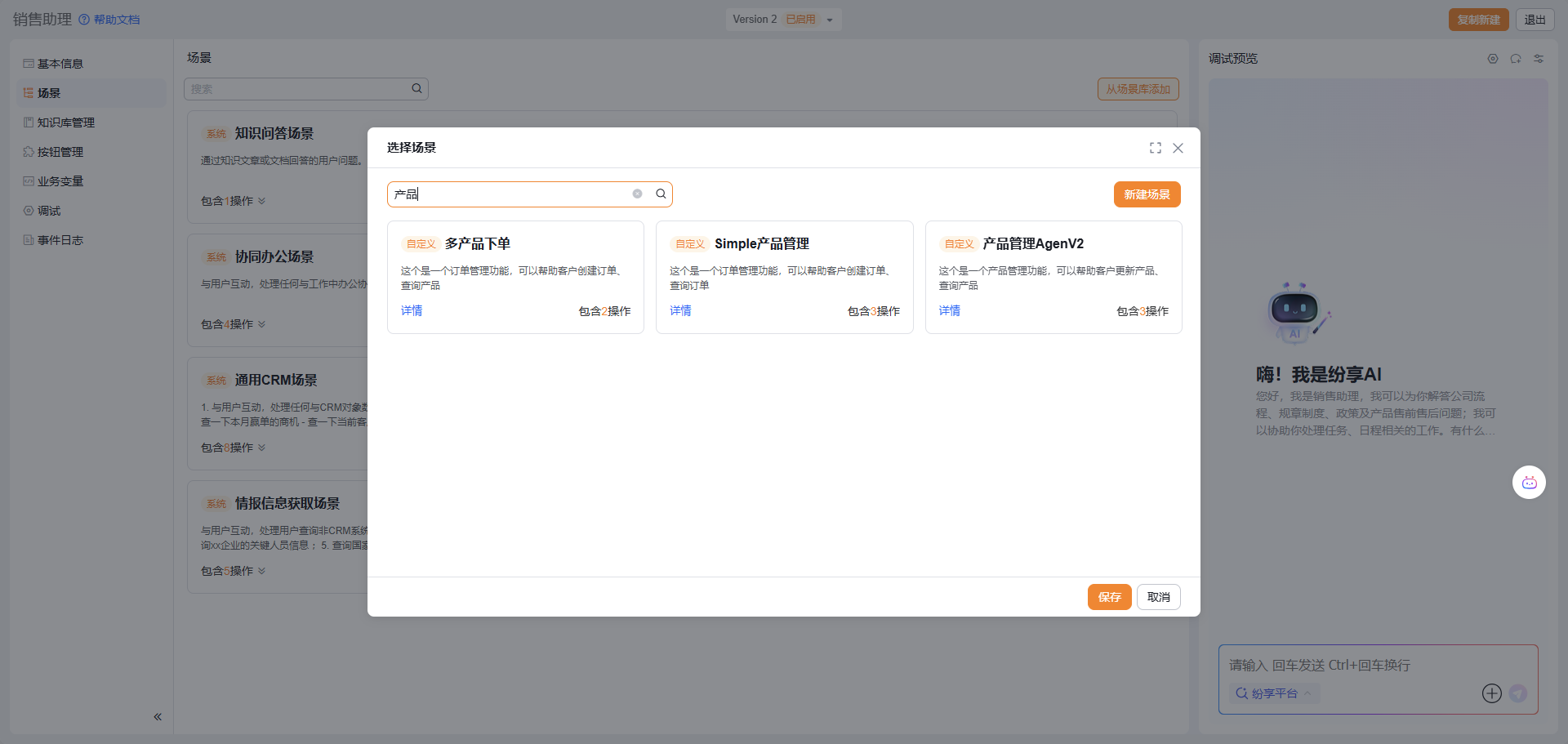 在 Agent 中可以从场景库中直接添加系统场景(纷享预置的场景)或自定义场景(租户中创建的场景)