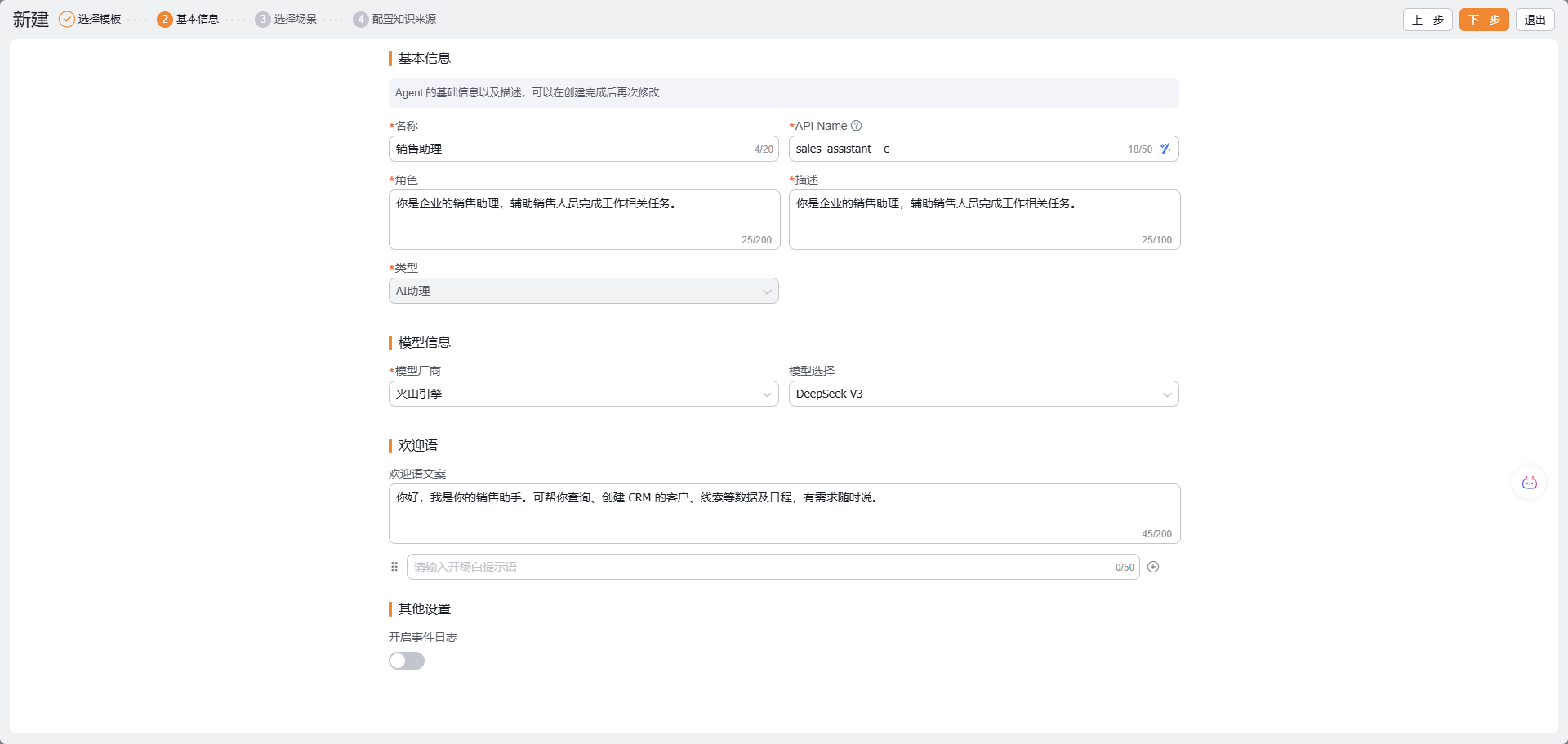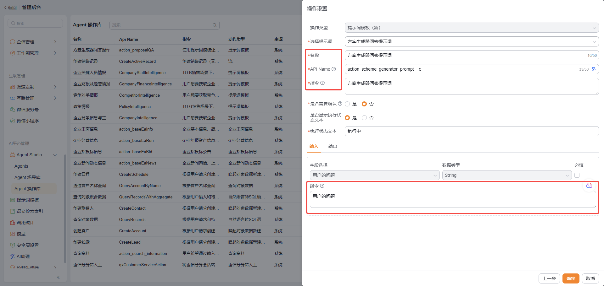 - 名称、APIName、描述信息:Agent 的基础信息