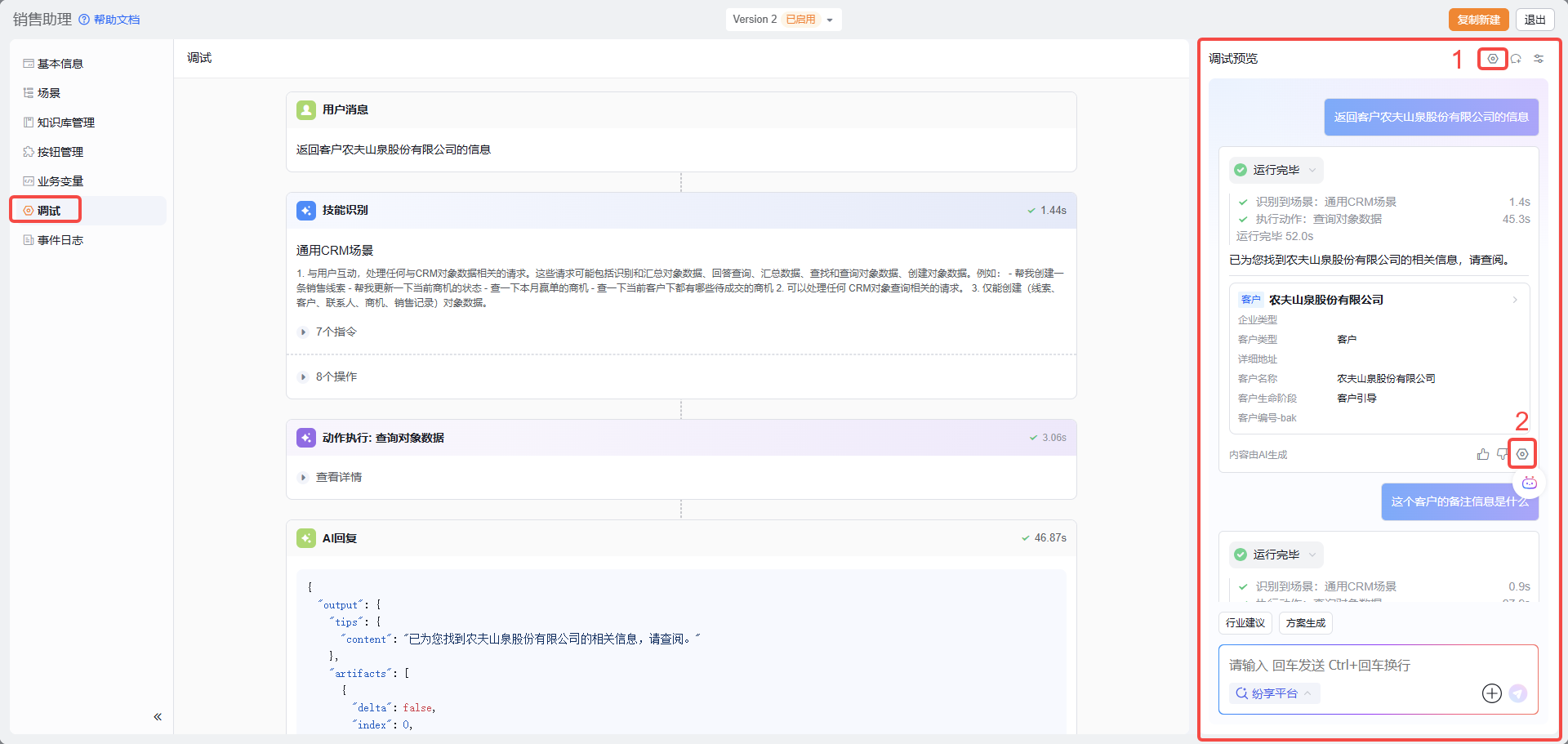 在调试预览对话框的Agent历史回复信息中,点击图中位置「2」的按钮,会把历史对话的调试信息展示在调试面板中