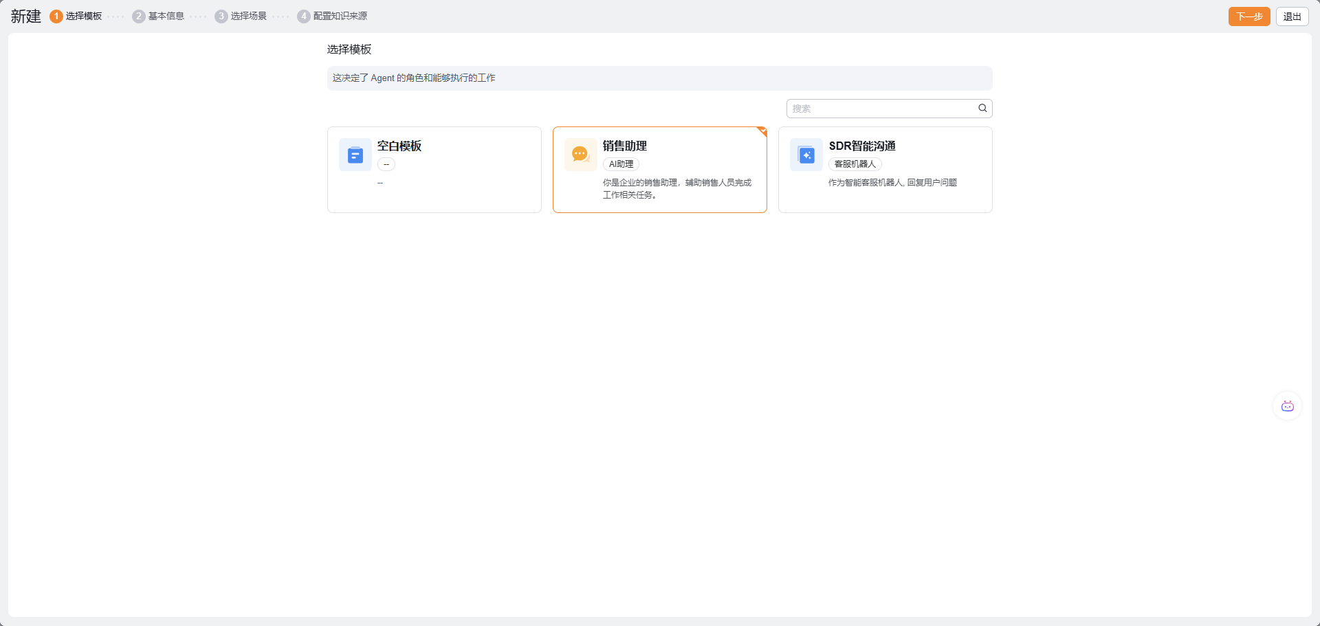 第一步:选择模板,可以选择空白模板或系统预置的Agent模板