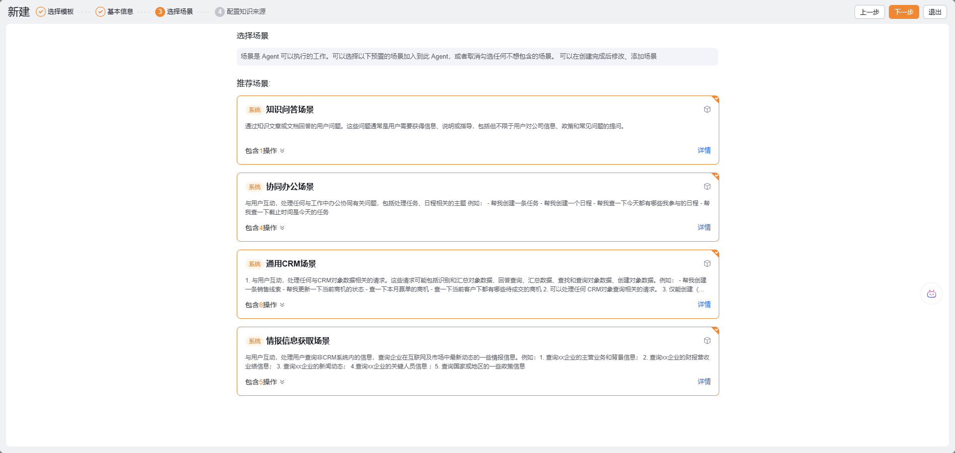 - 场景 3 有场景库 icon 和自定义场景标签,代表此场景为场景库的自定义场景,用户无法在 Agent 中直接编场景,可以点击跳转编辑按钮去场景库编辑,编辑的内容会在此租户中所有引用该自定义场景的 Agent 中生效