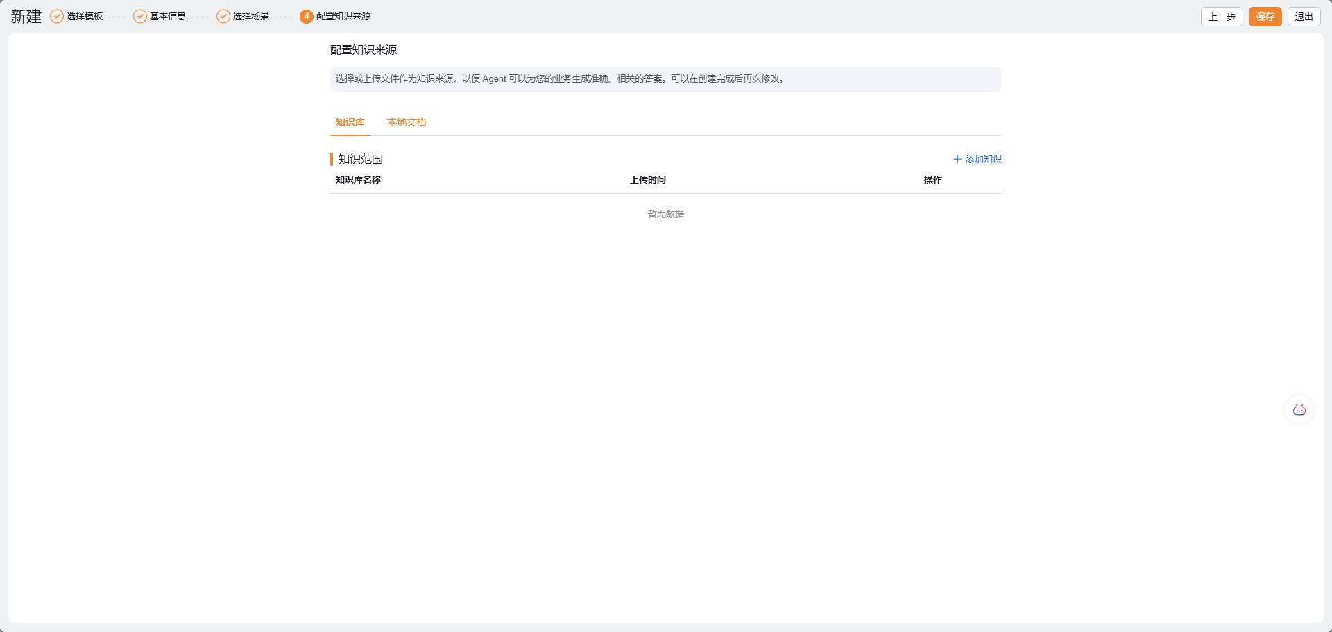 第四步:配置Agent的知识来源,可以选择知识空间或者上传本地文档
