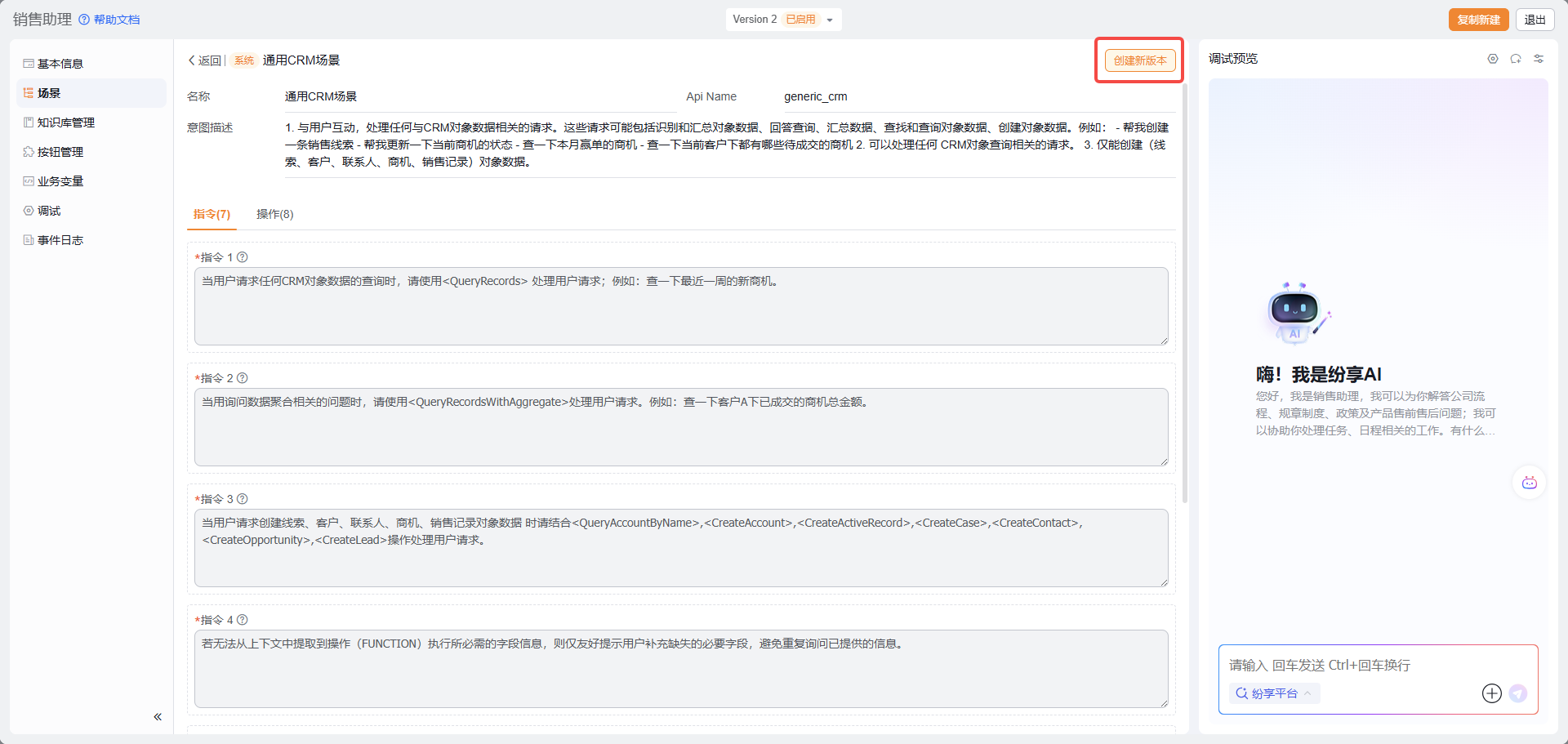 如果需要调整场景以适应当前 Agent 的业务需要,又不想影响其他使用此场景的 Agent,可以在 Agent 的场景中选择创建新版本