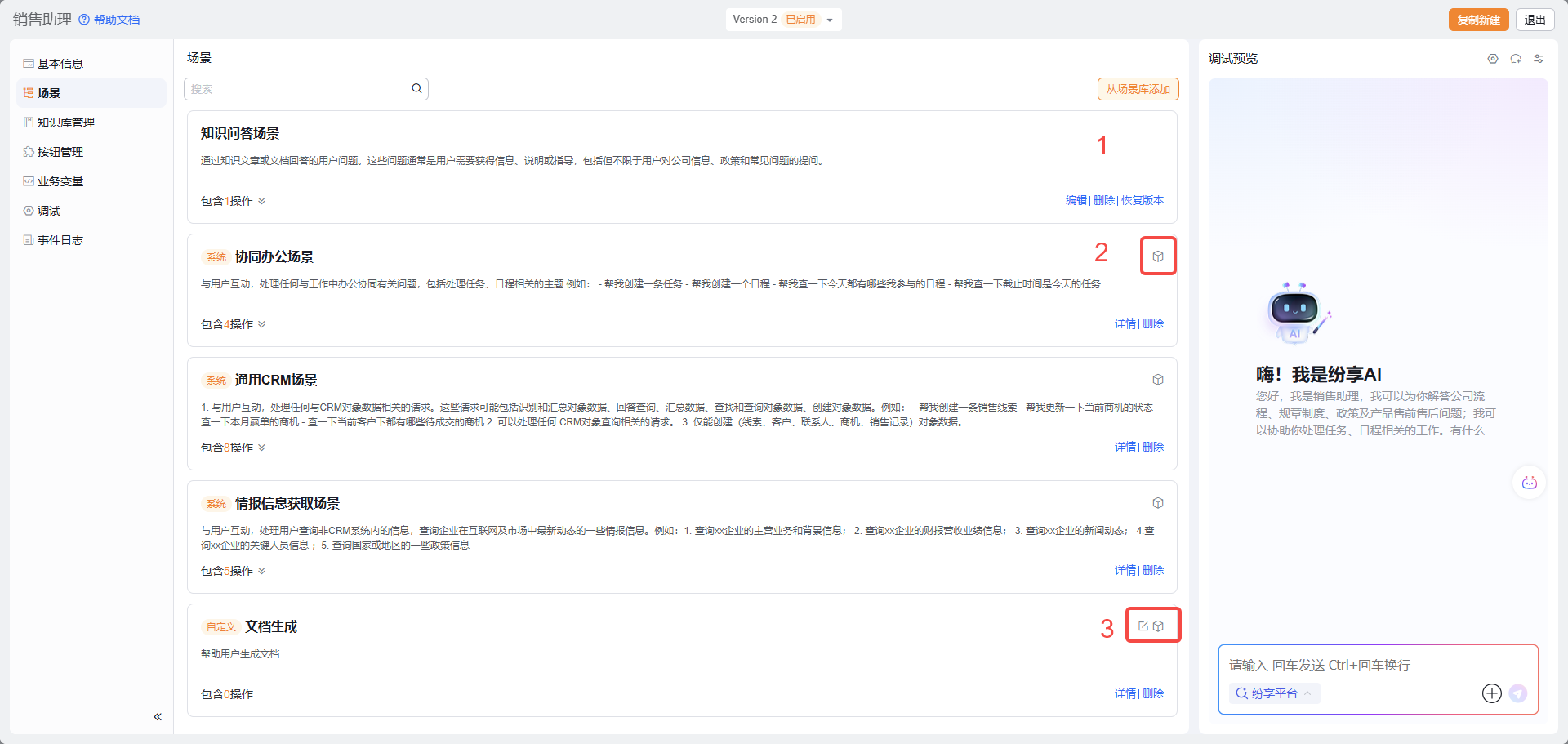 - 场景 2 有场景库 icon,代表此场景为场景库的系统场景,用户无法编辑场景,场景会随纷享发布新版本的系统场景自动升级