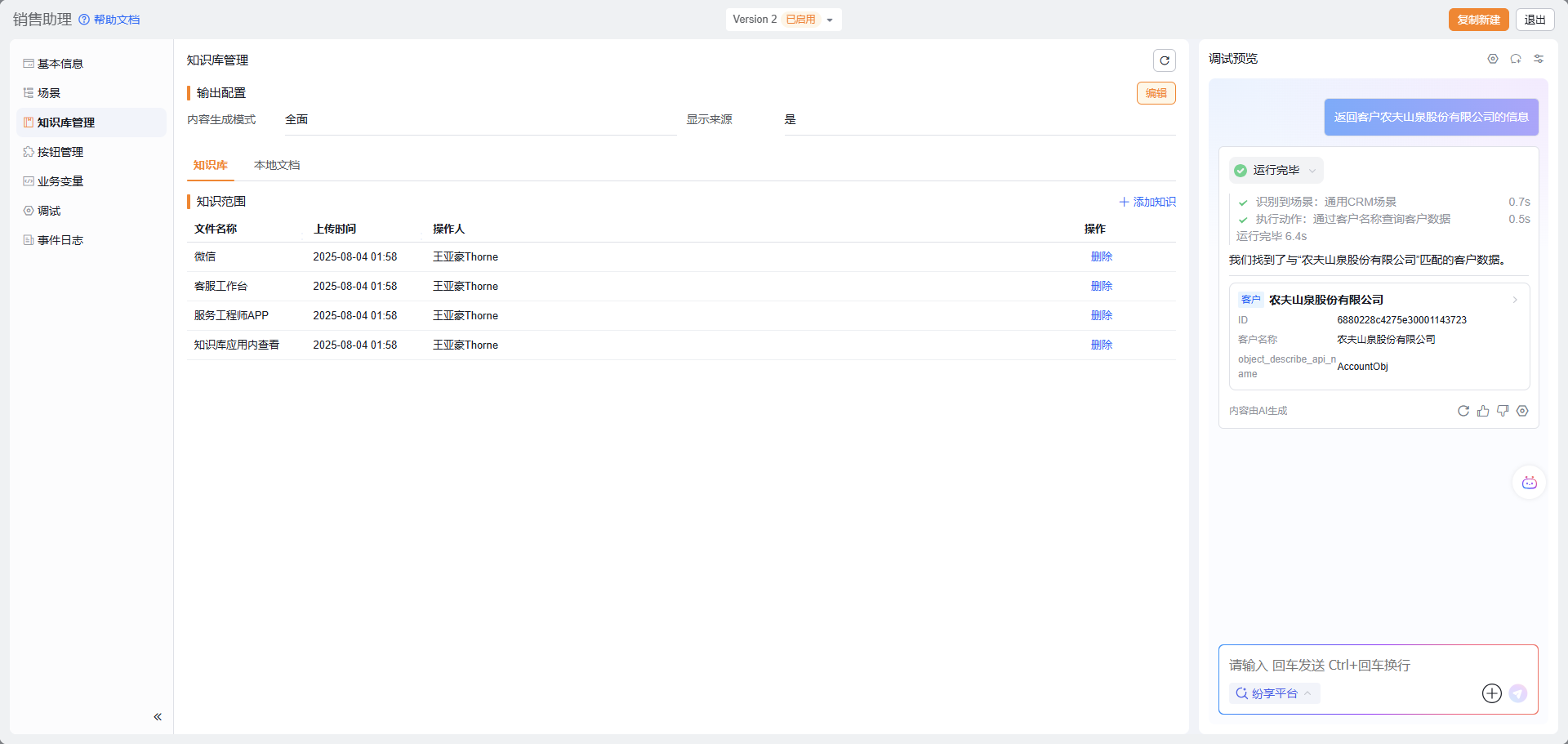 创建新版本后,场景库的场景会在此 Agent 中创建一个副本,用户可以直接修改该副本,并且不会影响场景库中的场景