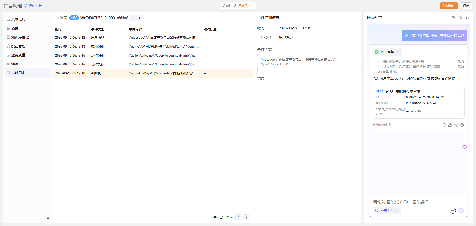 - 开启事件日志:开启后可以在 Agent 管理后台查看具体的调用日志