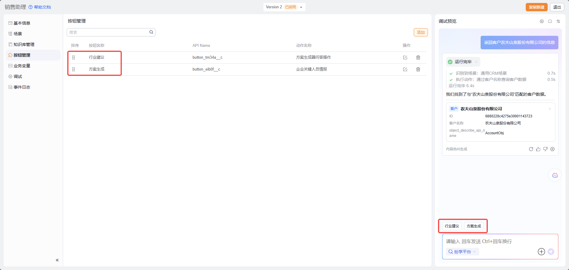 如果 Agent 中有确定的操作提供给用户执行,可以配置按钮按钮
