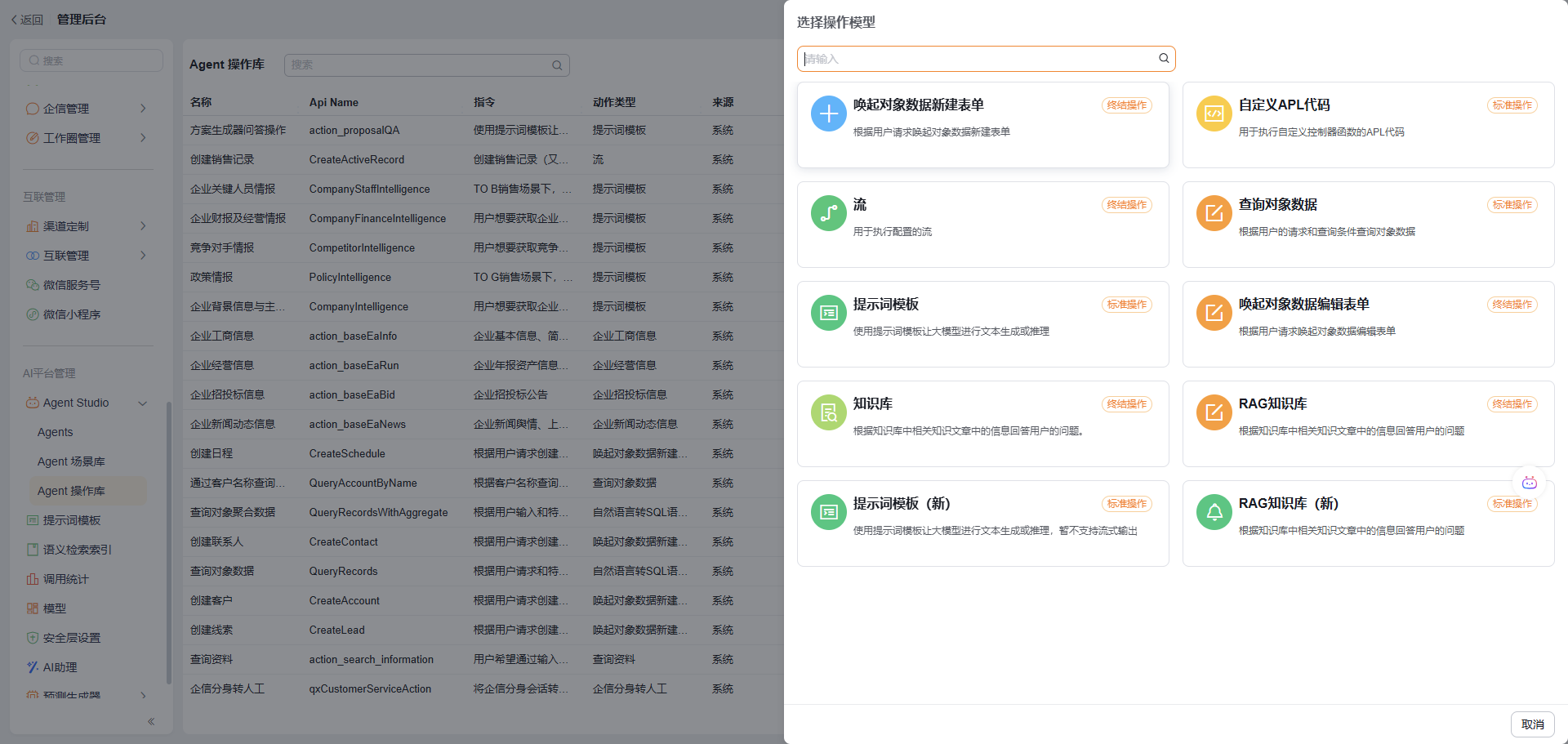 在场景中可以从操作库中直接添加系统操作(纷享预置的操作)或自定义操作(租户中创建的操作),完成操作的开箱即用配置