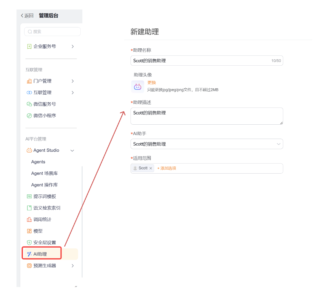 在 AI 助理菜单创建一个助理,选择我们配置好的 Agent