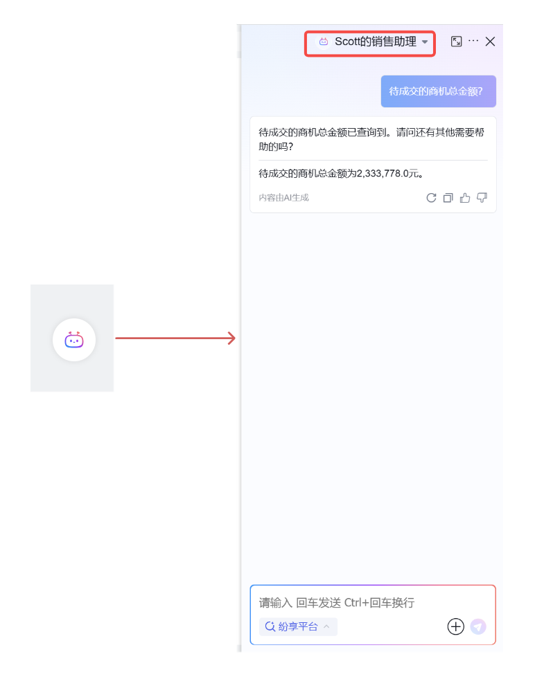 点击页面左下角的 ShareChat 图标,开启 ShareChat 窗口,选择我们配置好的 AI 助理,就可以使用Agent了