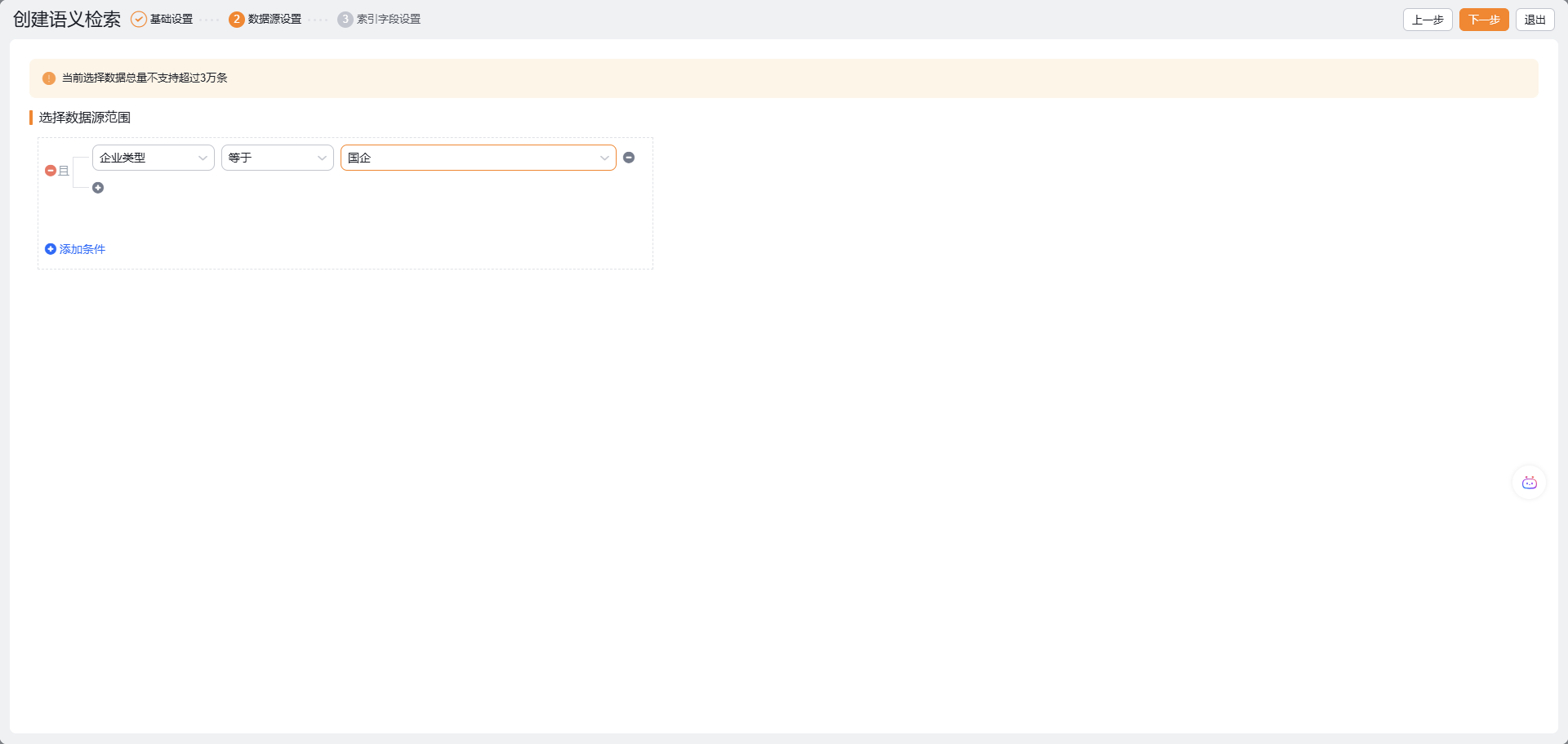 业务对象索引构建分为【基础设置】【数据源设置】【索引字段设置】3步