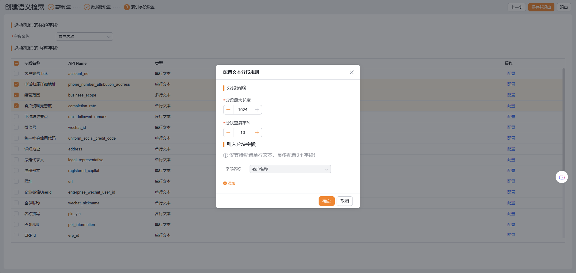 第3步,选择标题字段和知识内容字段,并配置内容字段的分段规则