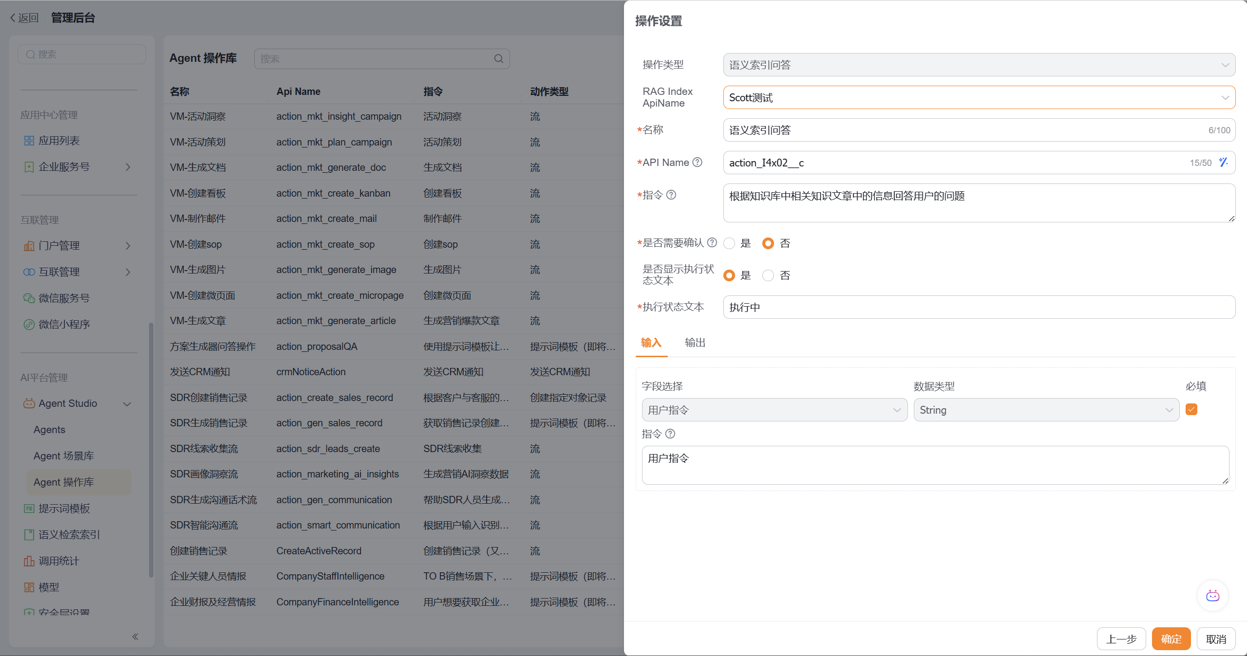 在操作库中添加RAG知识库类型的操作,并关联一个语义检索索引