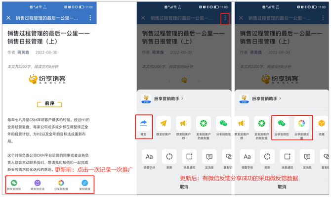 从营销通发全员推广到企业微信后,会收到营销助手的任务通知,员工点击任务卡片进去后进行内容推广,原有推广统计逻辑为,点击内容首页下方任意按钮一次,累加一次员工推广次数。更新后从内容首页点击下方【转发微信】【转发到回话】,或点击右上角三个点点进去点击【转发】【分享到微信】【分享到朋友圈】转发成功后,推广次数由企微接口回调累加,由于企微限制,若转发出去了留在微信,则无回调事件,无法统计,其次内容首页上的复制链接点一次,推广次数加一,点击右上角三个点进去,除上方提到的【转发】【分享到微信】【分享到朋友圈】三个按钮有推广统计外,由于微信无回调事件,其他的所有按钮无推广统计。
