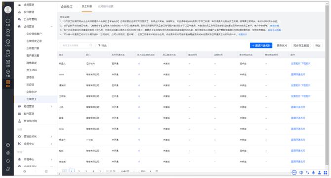 新增企微营销员工通讯录。开启企微营销后,企微SCRM菜单下展示员工通讯录,可进行查看员工激活状态、查看CRM账号绑定状态和同步员工数据等操作。