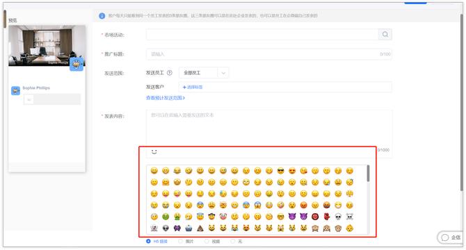 企微营销>消息群发/欢迎语,支持在内容中添加表情包。