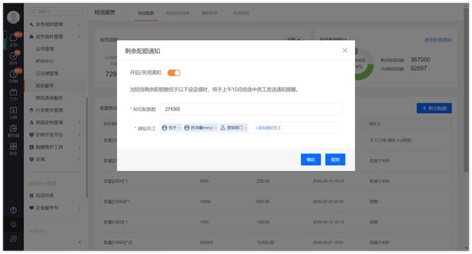 系统管理>业务插件管理>短信服务>剩余配额通知,可设置短信提醒配额数和通知员工。