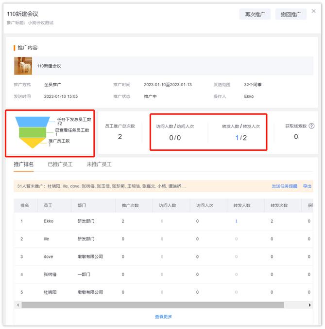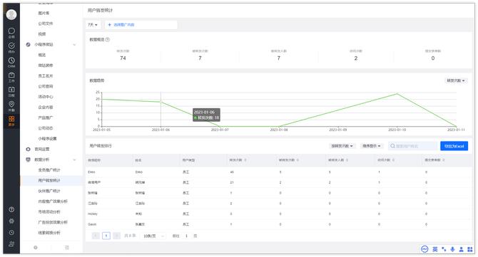 (1)支持记录用户主动转发内容的次数,包括:员工推广营销内容给到用户,用户转发给其他用户的次数;用户进入微官网,主动转发营销内容给其他用户的次数。