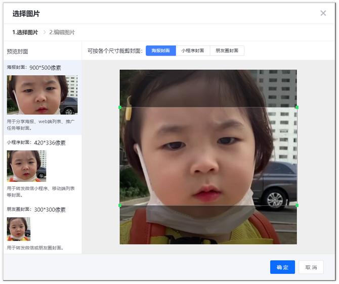 微页面、文章、产品的封面选择器更新为多尺寸截取,分别应用于海报封面、小程序封面和朋友圈封面。