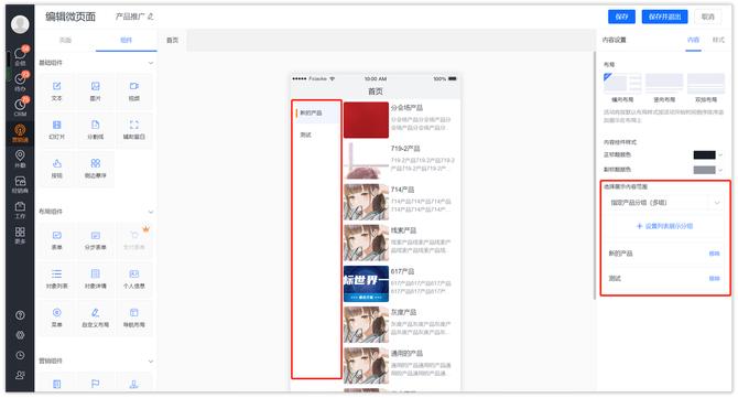 “产品推广”页面由原来固定页面更新为微页面,可支持灵活编辑和分享。在【小程序微站>产品推广>选择内容展示范围】,支持按分类展示产品列表。