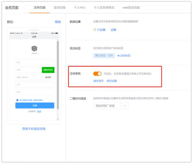 会员中心>注册页面>注册审核,开启后,会员报名需通过审核才可注册成功。若审核未通过,则无法享受会员权益。