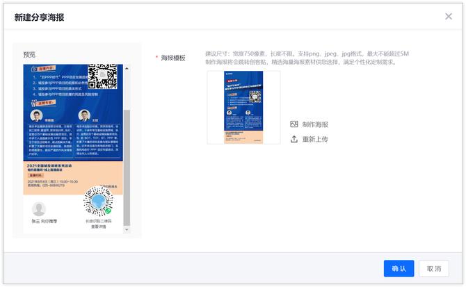 内容中心>文章/产品/微页面>分享海报,上传图片后,会自动拼接二维码和员工推广/用户转发信息。