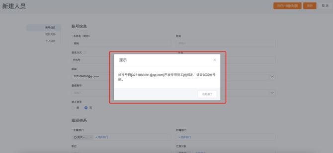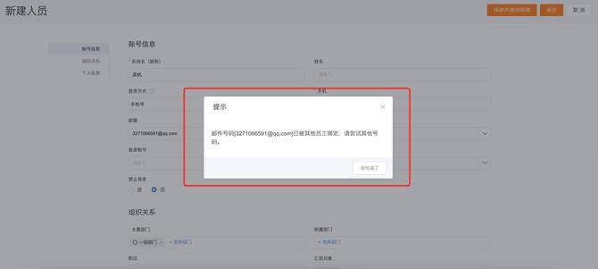 新建人员,如果出现手机/邮箱重复被占用时,提示信息补充具体占用的人员名称(包含停用人员)。