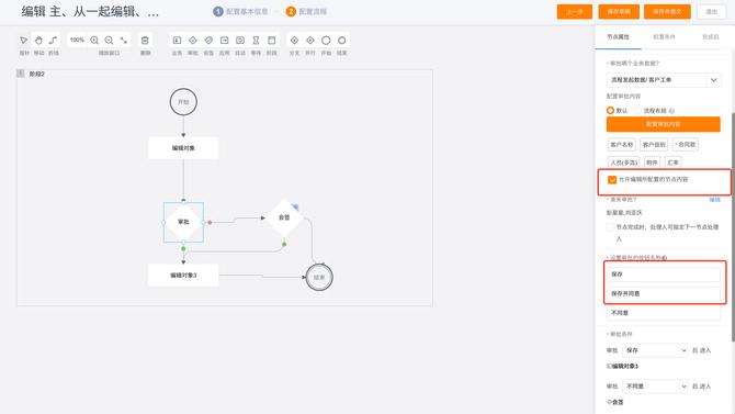 在业务流程配置审批节点后,可配置该节点的审批内容及审批按钮,允许当前处理人对配置好的字段进行编辑。