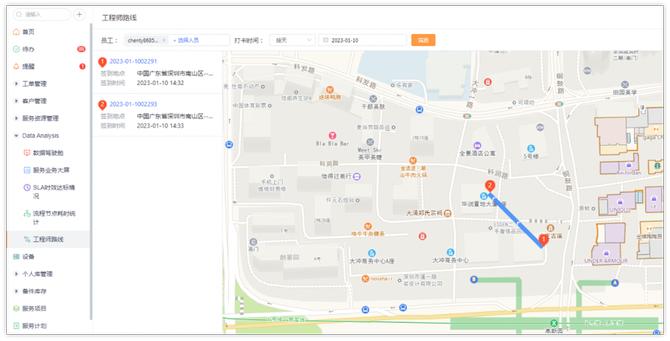 服务工程师信息新增工程师轨迹图,可根据工单打卡生成工程师的轨迹路径。