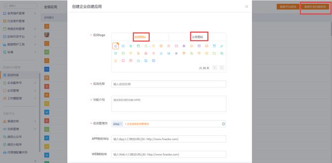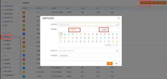 - 创建PaaS平台应用与企业自建应用时,在图标配置入口均可本地上传或从图标库中选择图标;