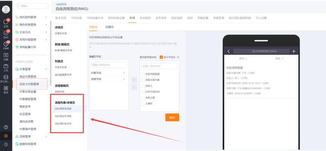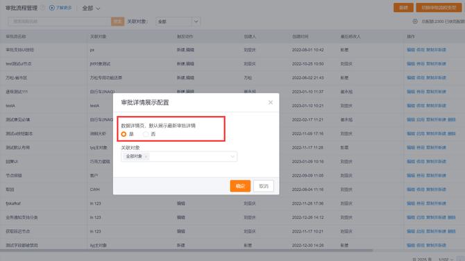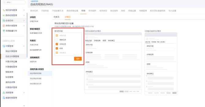 可在待处理审批流程的列表页和详情页中配置外露显示的字段信息,同时支持按对象进行独立配置。