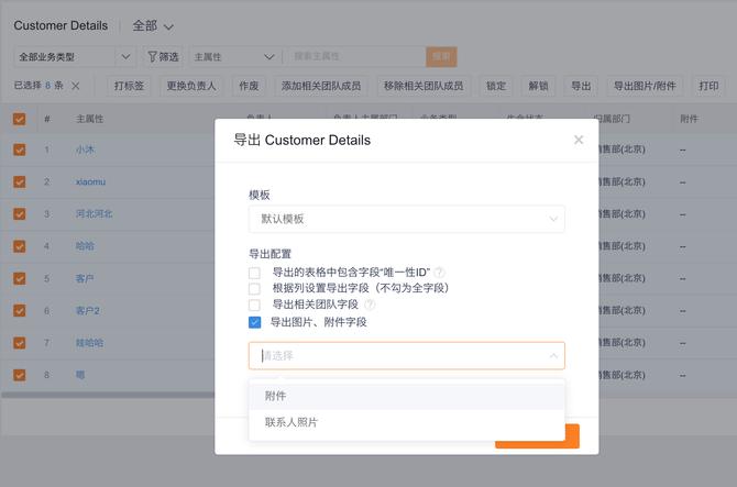 对象在导出时,新增【导出图片、附件字段】配置,并可选择导出哪些字段。当导出为Excel后,默认不勾选,双击即可跳转至本地文件。(图片附件打包到本地,打包的格式为:图片和附件在一个文件夹下)