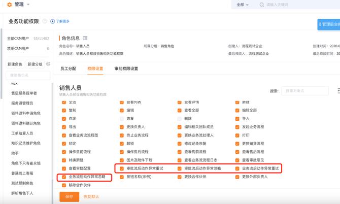 在业务功能权限中,对预置/自定义对象增加【流程异常重试】、【流程异常忽略】配置;当流程后动作函数执行异常时,被授权的人员/角色可点击【重试】、【异常】。