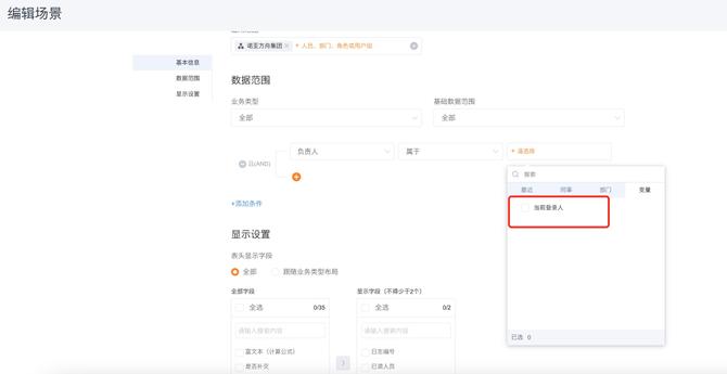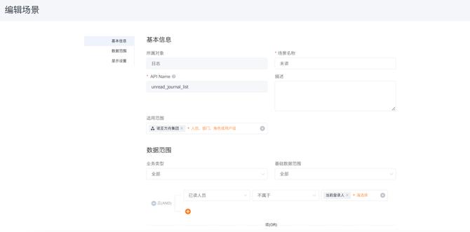 预设对象—日志/销售记录,支持配置场景管理,可在前端对设置的场景进行筛选(预置的场景不支持编辑)。