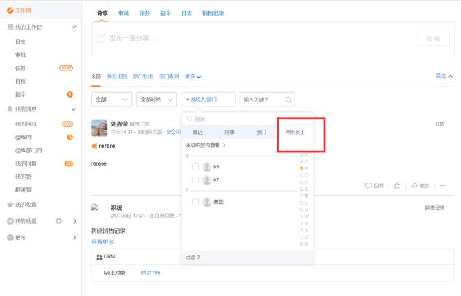 在工作圈——分享列表筛选中增加停用员工维度,可筛选停用员工分享的内容。